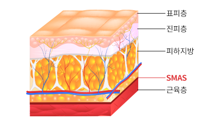 SMAS층은 피하지방층과 근육층 사이에 얇게 존재하는 표정근육층으로, 피부와 근육을 연결하고 잡아주는 기능을 합니다. SMAS층이 노화되면 피부가 처지고 주름이 생기는 원인이 되므로, 리프팅 수술시 SMAS층까지 피부당김이 이뤄져야 오랫동안 동안 효과를 보실 수 있습니다.